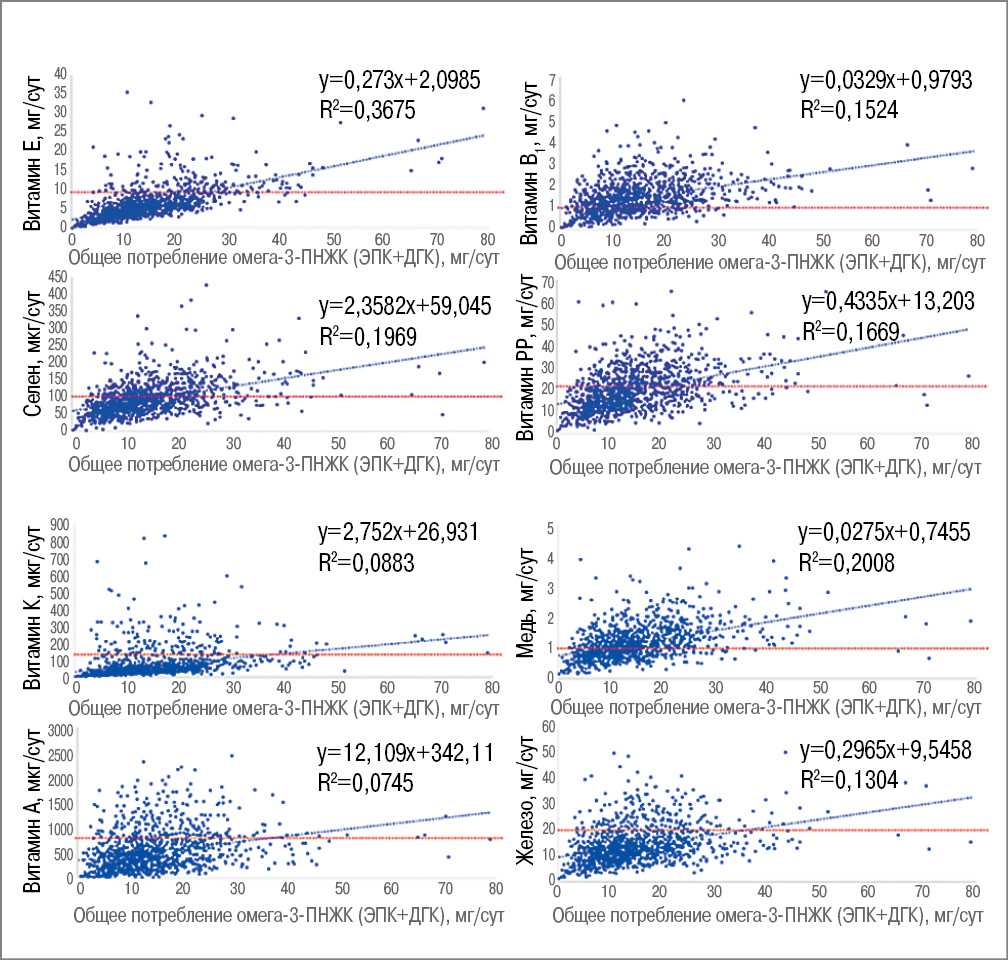 Несмотря на то, что диетарное потребление ДГК и ЭПК по отдельности слабо коррелирует с потреблением других микронутриентов (соответствующие точки находятся вне кластера на рис. 1), суммарное потребление омега-3-ПНЖК (ЭПК+ДГК) достоверно ассоциировано с потреблением ряда витаминов и микроэлементов. На рис. 2 представлены наиболее выраженные примеры этих корреляций.