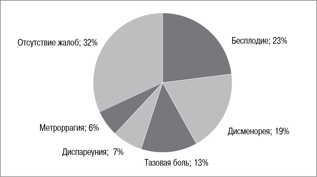 Средний возраст обследуемых пациенток составил 32,7±6,72 года. Основные жалобы, предъявленные пациентками в предоперационном периоде, представлены на рис. 1.