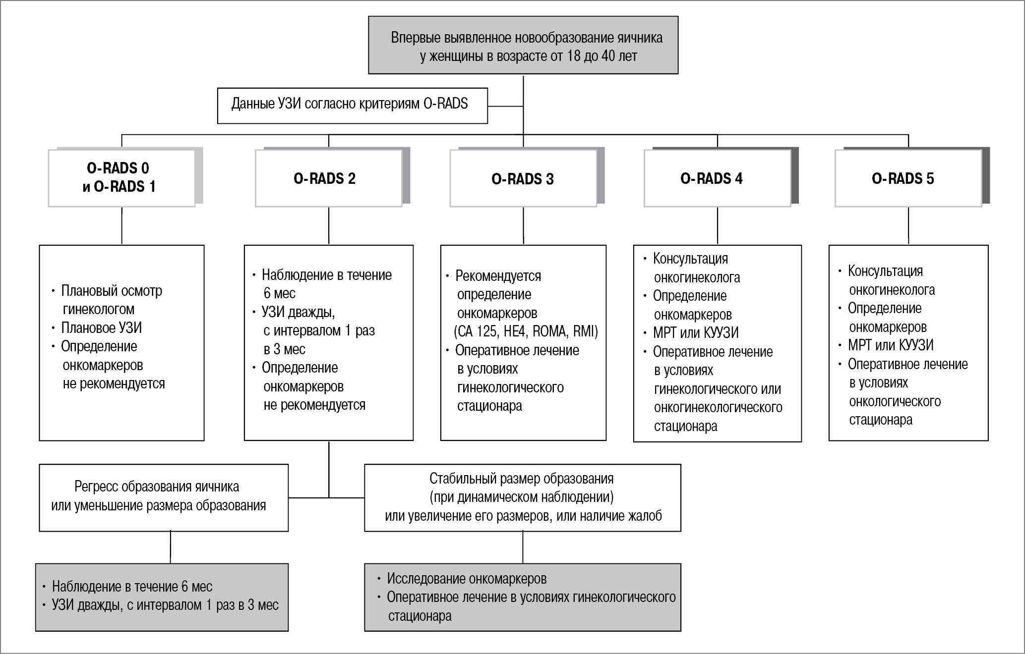 На основании полученных данных предложен алгоритм предоперационной диагностики и наблюдения за женщинами с впервые выявленным новообразованием яичника. Пациенткам с O-RADS 2 показано наблюдение гинеколога в течение 6 мес с выполнением контрольного УЗИ 1 раз в 3 мес. При выявлении критериев O-RADS 3 в качестве предоперационной диагностики рекомендовано включать определение онкомаркеров и проведение оперативного лечения в условиях гинекологического стационара с последующим морфологическим исследованием полученного материала. Определение критериев O-RADS 4 и O-RADS 5 требует назначения дополнительных методов обследования, таких как исследование онкомаркеров (СА 125, НЕ4, ROMA, RMI), КУУЗИ и МРТ. КУУЗИ показало высокую диагностическую эффективность при наличии критериев O-RADS 4, что позволило предопределить необходимую тактику ведения пациенток со «сложными» опухолями. Консультация онколога-гинеколога должна быть назначена при стойко нерегрессирующем новообразовании яичника, при повышении уровня опухолевых маркеров и УЗ-картины, подозрительной на злокачественное новообразование яичника. При неясной характеристике новообразования необходимо рассмотреть возможность оперативного лечения в условиях онкологического стационара.