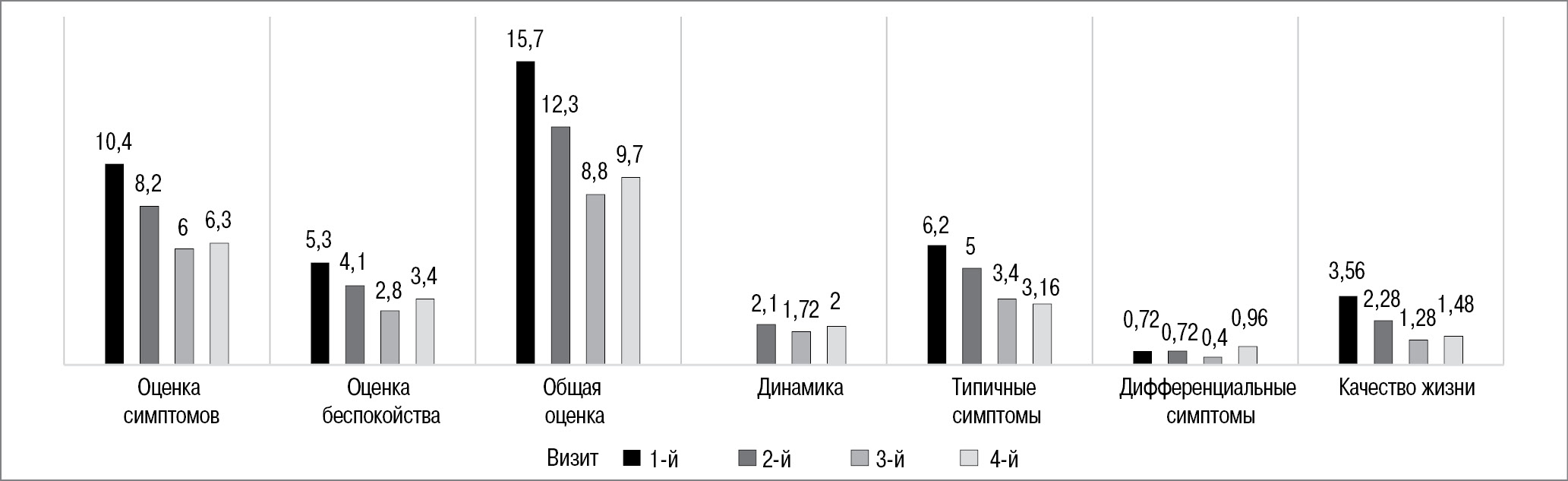 В ходе проведенного исследования отмечены хорошая переносимость терапии, а также уменьшение клинической симптоматики во всех 3 группах пациенток. Суммарный балл по шкале PUF (3 группы пациенток) на 1-м визите составил 16,6 с последующей тенденцией к уменьшению до 10 баллов на 4-м визите. Суммарный балл типичных и дифференциальных симптомов по шкале ACSS на 1-м визите составил 7,3 и 1,16 соответственно, в то время как на 4-м визите данные показатели составили 3,55 и 0,71 балла соответственно. Суммарная оценка динамики изменения состояния в ходе проводимой терапии при контрольном посещении по данным шкалы ACSS (3 группы пациенток) – 2,17 балла на 2-м визите, на 4-м – 1,5 балла. Суммарный балл качества жизни по шкале ACSS (3 группы пациенток) на 1-м визите составил 3,69, на 4-м визите – 1,5. Сравнение основных показателей представлено в табл. 1; динамика изменения суммарного балла по данным валидированных шкал представлена на рис. 1–3.