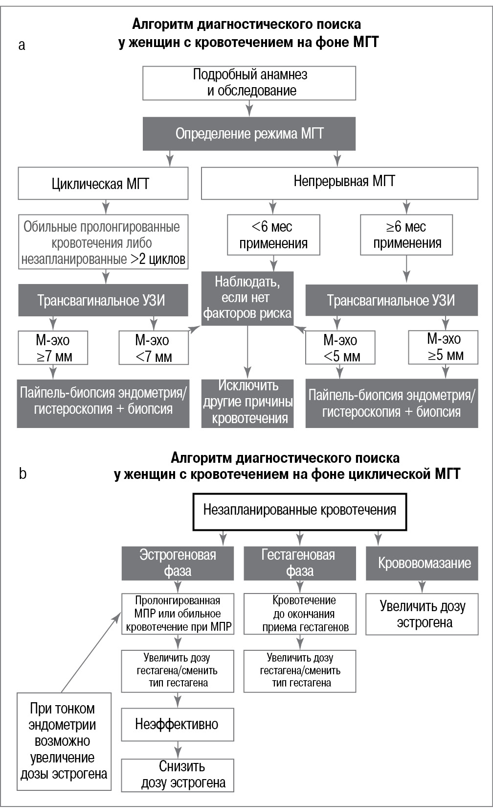 Рис. 2. Алгоритм диагностического поиска при кровотечении на разных режимах МГТ [4, 14, 16]. / Fig. 2. Algorithm of diagnostic search for bleeding in different modes of MHT [4, 14, 16].