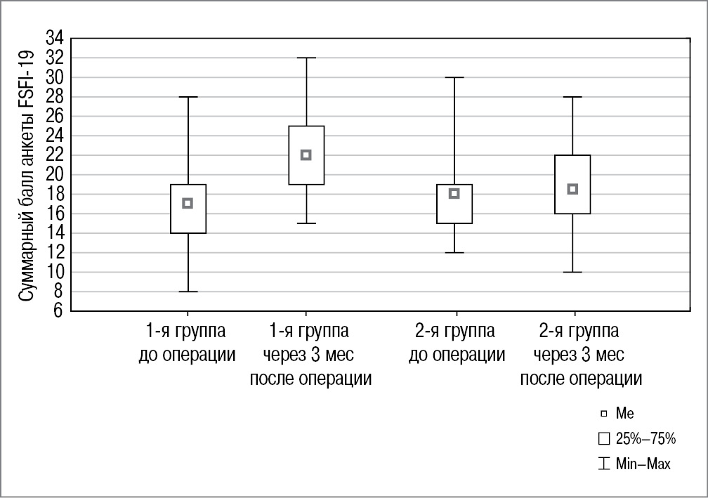 У пациенток 1-й группы наблюдается повышение индекса женской сексуальной функции на фоне RF-терапии: до операции – 17 (14; 19) баллов, через 3 мес после хирургической коррекции ПГ – 22 (19; 25) балла, p=0,003. У пациенток 2-й группы различия в величине индекса FSFI-19 до операции и через 3 мес после операции оказались статистически не значимы: 18 (15; 19) и 19 (16; 22) баллов соответственно, p=0,08.