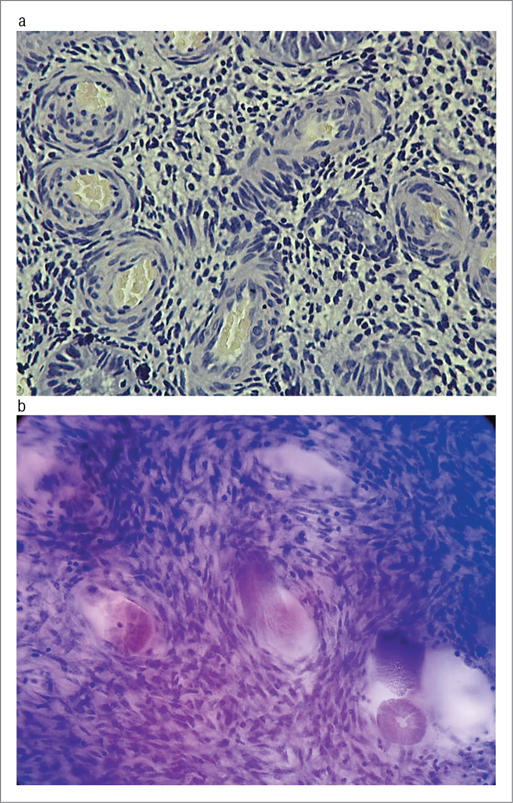 Диагноз «полная (развернутая) форма ХЭ» установлен при наличии выраженных стромальных изменений (фиброза строма, склероза сосудов), как при наличии воспалительных инфильтратов, так и в отсутствие таковых.