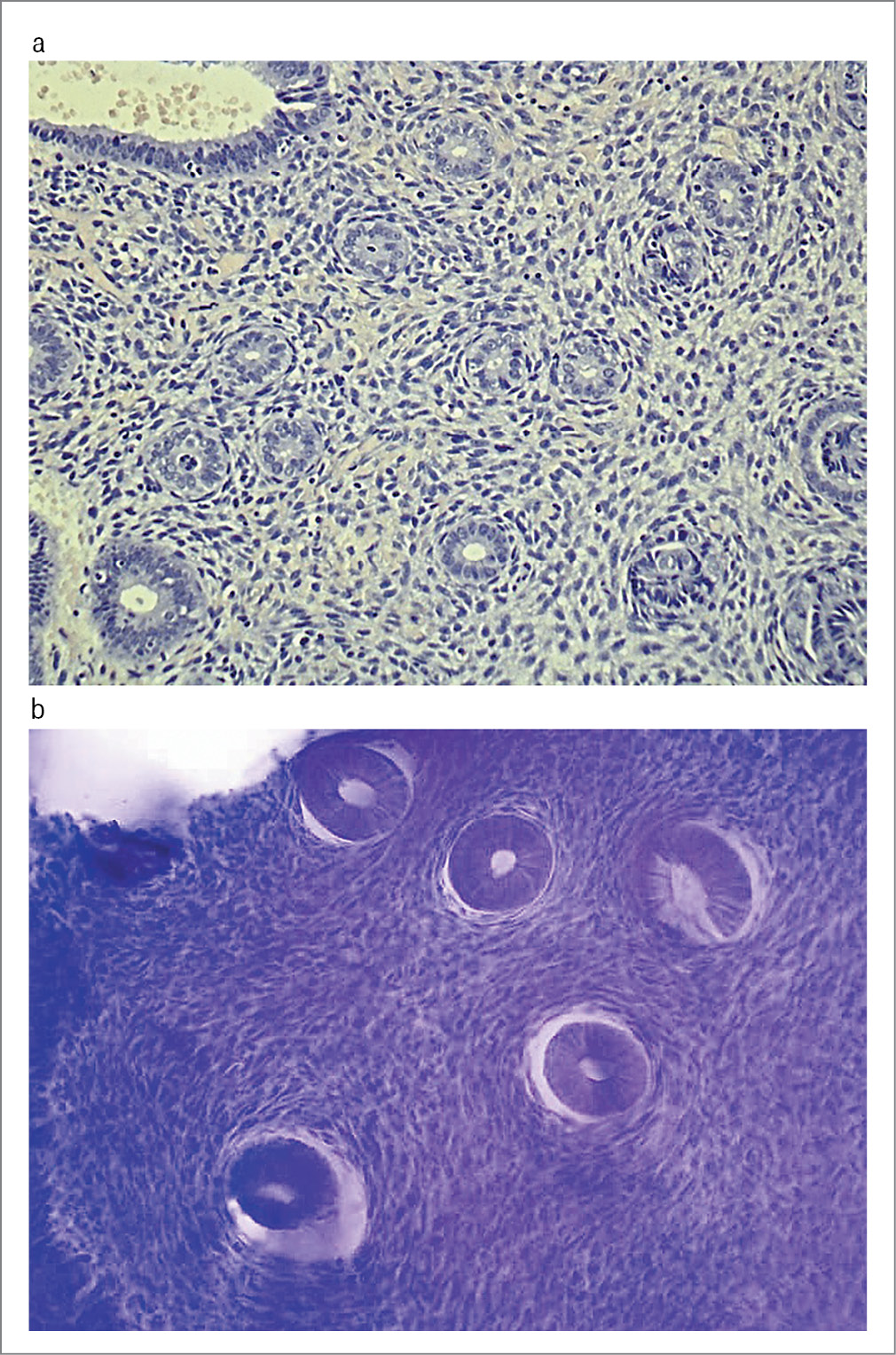 Для оценки гистологического и ИГХ-исследования эндометрия использовали световой микроскоп Leica DM 3000 (Германия). В окрашенных препаратах оценивали состояние желез эндометрия и стромы, их соответствие фазе менструального цикла. При оценке состояния стромы учитывали наличие и характер фиброза, воспалительной инфильтрации, количество и калибр спиральных артерий, толщину их стенок. Экспрессию CD138 оценивали путем подсчета позитивных клеток в поле зрения при увеличении ×400 (при подсчете не менее 10 полей зрения).