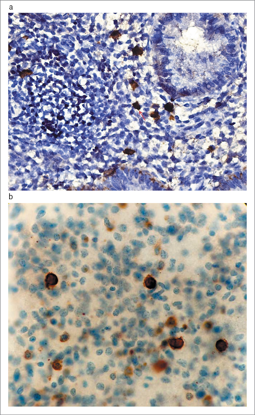 Однако при использовании обычного окрашивания гематоксилином и эозином зачастую даже опытному морфологу бывает трудно отличить ПК от моноцитов и фибробластов стромы, поэтому вопрос о точности диагностики остается достаточно субъективным [7]. Обнаружено, что ИГХ-окрашивание на CD138 улучшает чувствительность и точность идентификации ПК [9, 10]. Однако нет консенсуса, какое количество ПК достаточно для постановки диагноза. В метаанализе с участием 1879 женщин отмечено, что два критерия (≥1 ПК на срез и ≥5 ПК в поле высокой мощности) использовались исследователями чаще всего [10], однако в каждом из представленных случаев не исключен риск гипо/гипердиагностики.