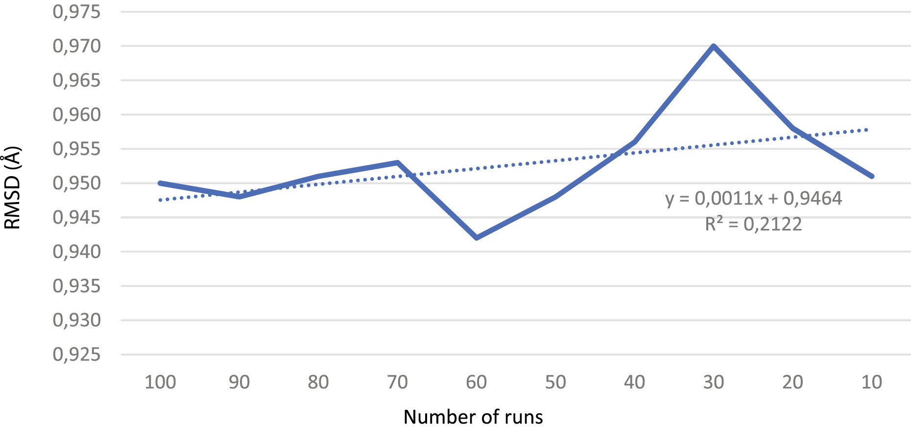 Results. All experiments produce identical bond free energy, where the maximum difference in inhibition constant is only 0.06 nM. The lowest RMSD is indicated by the number of runs of 60, with a RMSD value of 0.942. There is no linear relationship between the number of runs and RMSD, with R in the linear equation of 0.4607.