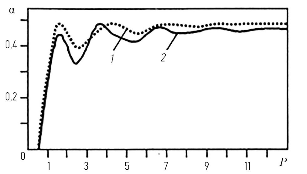 На рис. 1 представлены вероятности ложной тревоги от числа размножений α (P) при фиксированном пороге обнаружения аномальных измерений и аппроксимации полиномом первой (кривая 1) и второй (кривая 2) степени.