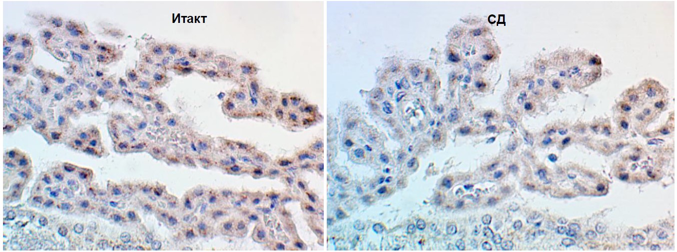 В хориоидальных сплетениях интактных животных БК визуализировался преимущественно в клетках эпендимы, в виде иммунопозитивных цитоплазматических гранул. В группе животных с экспериментальным СД 1-го типа отмечалось умеренное уменьшение интенсивности окрашивания (рис. 2). Преобладали эпендимоциты со слабой и средней экспрессией БК, и лишь в единичных клетках отмечалось выраженное окрашивание цитоплазмы. По результатам морфометрического исследования относительная площадь иммунопозитивного материала в сосудистых сплетениях головного мозга составила (14,08 ± 1,15) % в группе интактных животных и (8,26 ± 1,19) % при моделировании стрептозотоцининдуцированного сахарного диабета (р = 0,028).