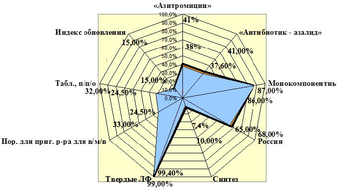 Рынок сформирован за счет 11 групп согласно АТХ-классификации, где первую ранговую позицию занимает JO1FА10 «Азитромицин» – 37,6%; фармакотерапевтическая группа «Антибиотик – азалид» – 37,6 %; монокомпонентного состава – 87 %; по производственному признаку в ассортименте установлено значительное преобладание доли лекарственных препаратов отечественного производства – 65 %; лидером является компания «Синтез» – 10 %. В общей структуре фармацевтического рынка доминируют твердые лекарственные формы – 99 % в виде порошка для приготовления раствора для внутримышечного введения и таблеток, покрытых пленочной оболочкой – по 33 и 32 % соответственно. Средний индекс обновления составляет 15 % (см. рис.).