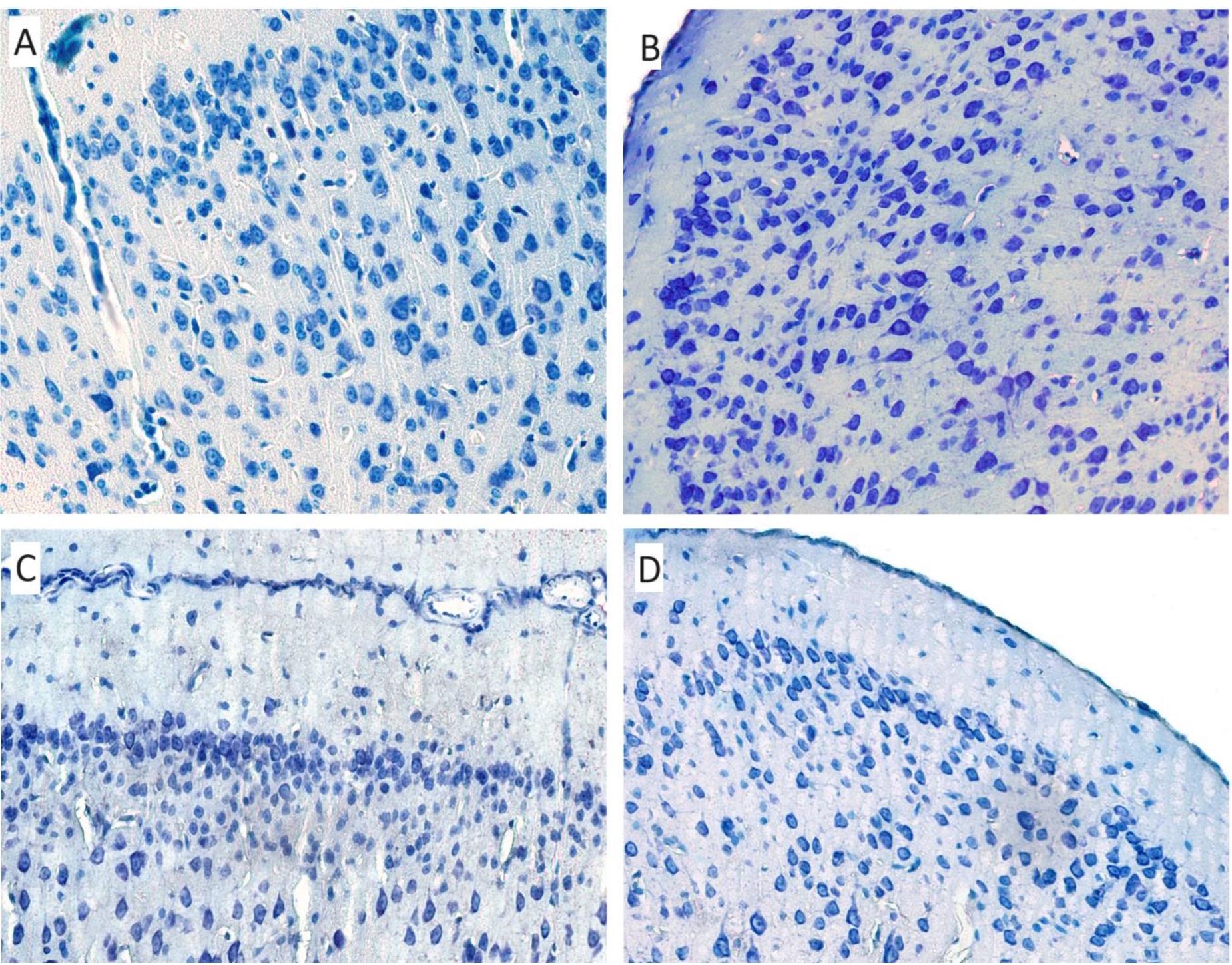 Рис. Гистологическое строение ретроспленальной коры головного мозга мыши, окраска тионином по методу Ниссля, ×400: A, C – гранулярная ретроспленальная кора головного мозга; B, D – агранулярная ретроспленальная кора головного мозга; A, B – группа интактных мышей; C, D – группа стрессированных мышей