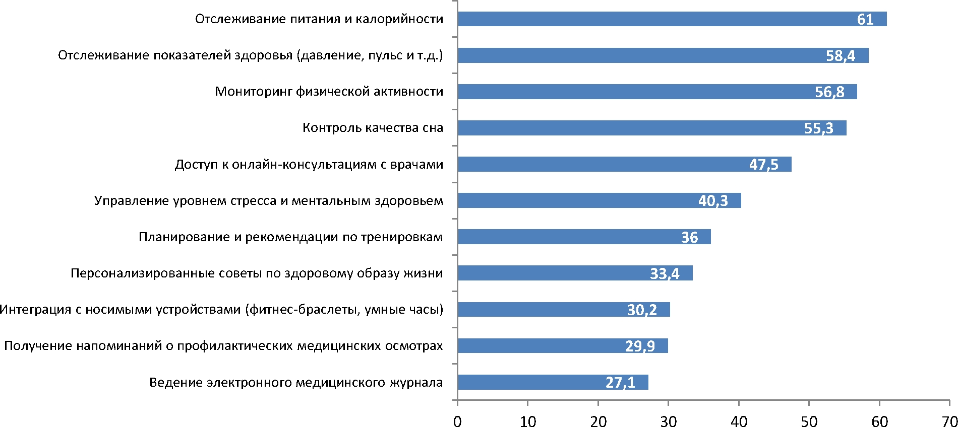 Рис. 1. Распределение ответов респондентов на вопрос о наиболее полезных функциях цифрового помощника здоровья (% от общего количества выбранных ответов)