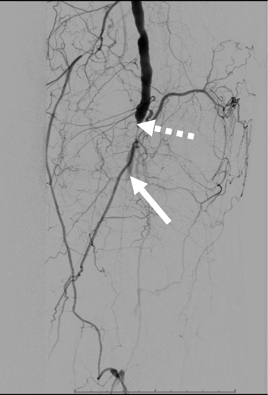 Рис. 1. Ангиограмма больной М. до ангиопластики. Стеноз подколенной артерии (прерывистая стрелка). Окклюзия артерий голени (сплошная стрелка)