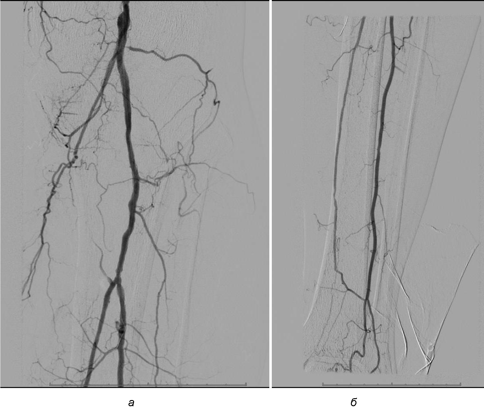 Рис. 2. Ангиограмма больной М. после ангиопластики. Восстановление магистрального кровотока в проксимальном (а) и дистальном (б) отделах голени
