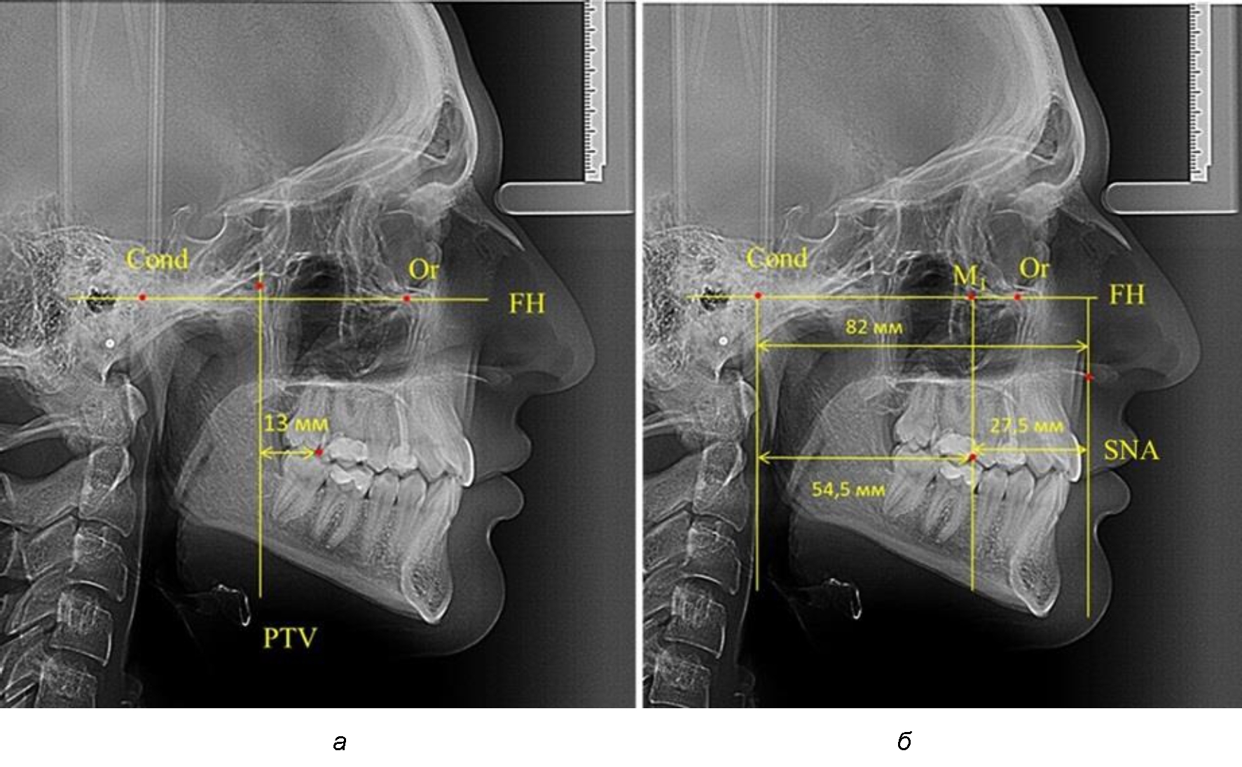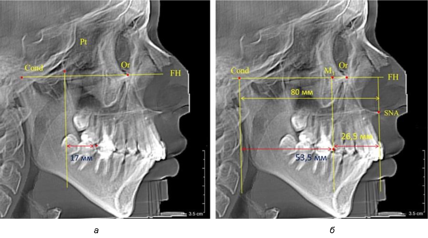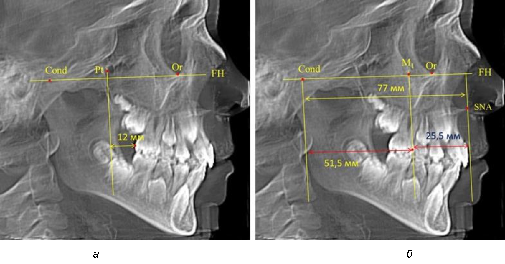 Рис. 3. Особенности положения первых моляров по R. E. McDonald (а) и по предложенному методу (б) при увеличенном молярно-крыловидном расстоянии