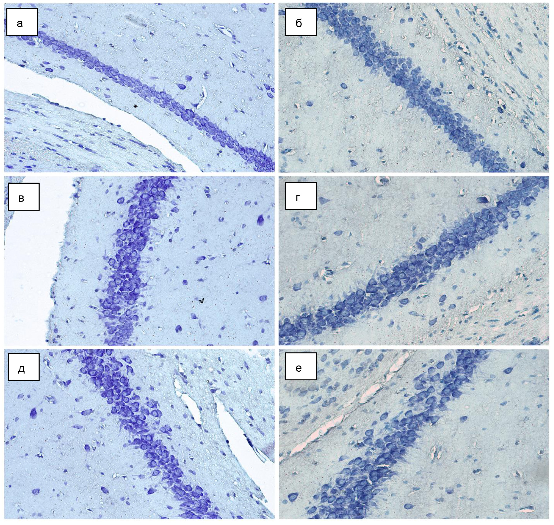 Рис. 1. Морфология гиппокампа мыши, окраска тионином по методу Ниссля, ×400: а, б – поле CA1; в, г – поле CA2; д, е – поле CA3; а, в, д – группа интактных мышей; б, г, е – группа стрессированных мышей
