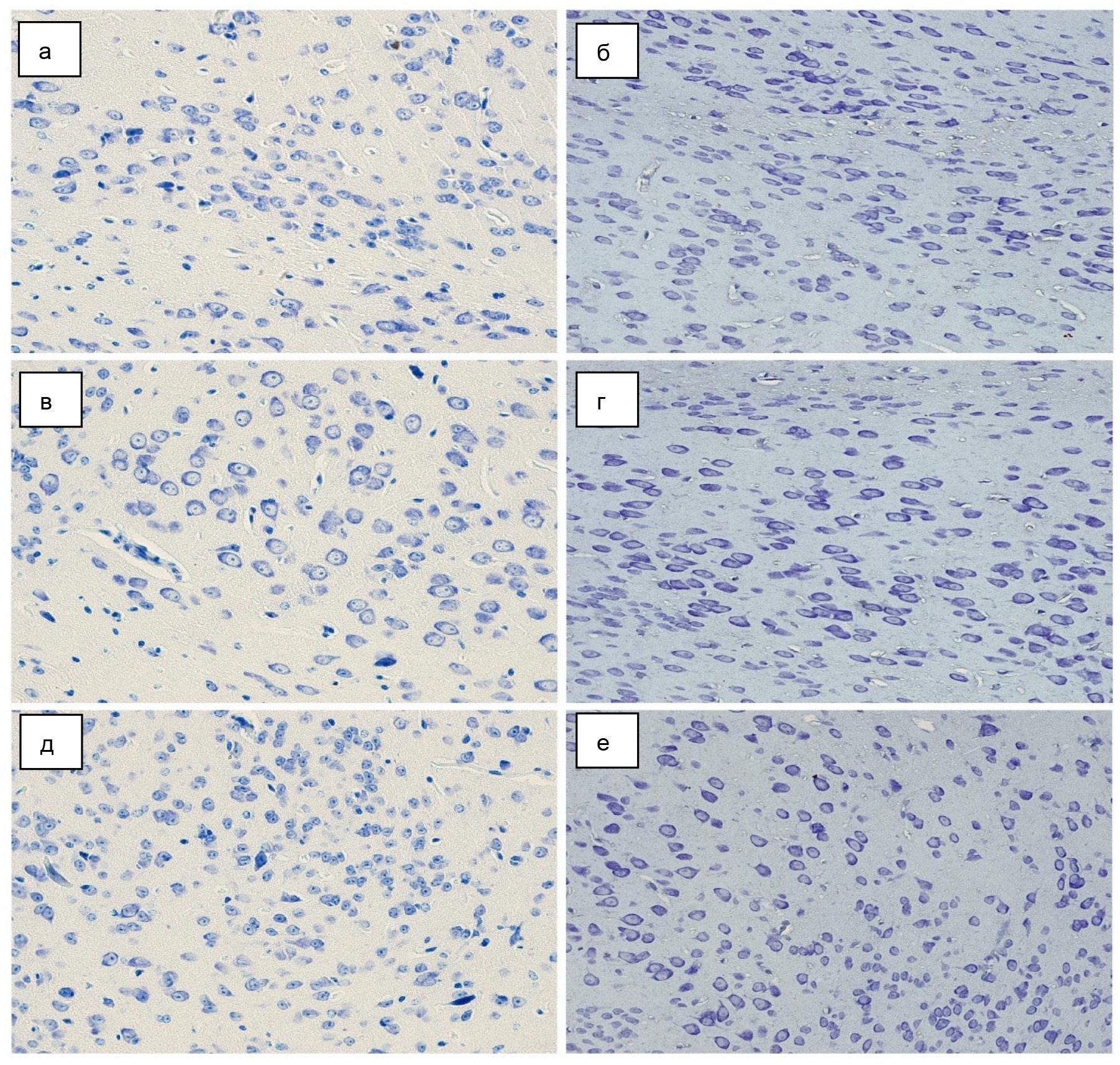 Рис. 2. Морфология миндалевидного тела мыши, окраска тионином по методу Ниссля, ×400: а, б – латеральное ядро; в, г – базо-латеральное ядро; д, е – базо-медиальное ядро; а, в, д – группа интактных мышей; б, г, е – группа стрессированных мышей