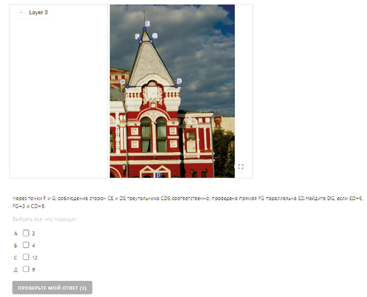 На рис. 1 представлено одно из заданий математической эстафеты. Для выполнения задания учащимся необходимо решить задачу и выбрать правильный ответ: через точки F и G, принадлежащие сторонам CE и DE треугольника CDE соответственно, проведена прямая FG, параллельная СD. Найдите DG, если ED = 6, FG = 3 и CD = 9.