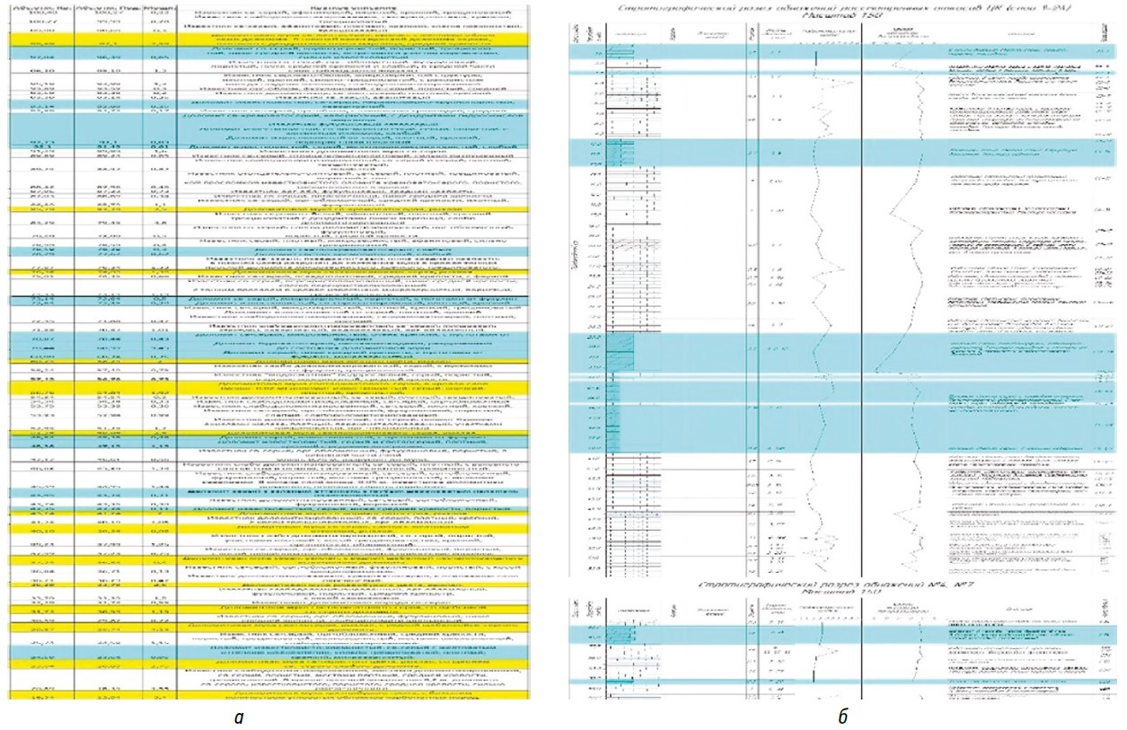 Рис. 1. Сравнение скважины № 7 (а) и современных слоев Царёва кургана (б), желтый — доломитовая мука; голубой — доломиты; белый — известняки (доломитизированные породы)