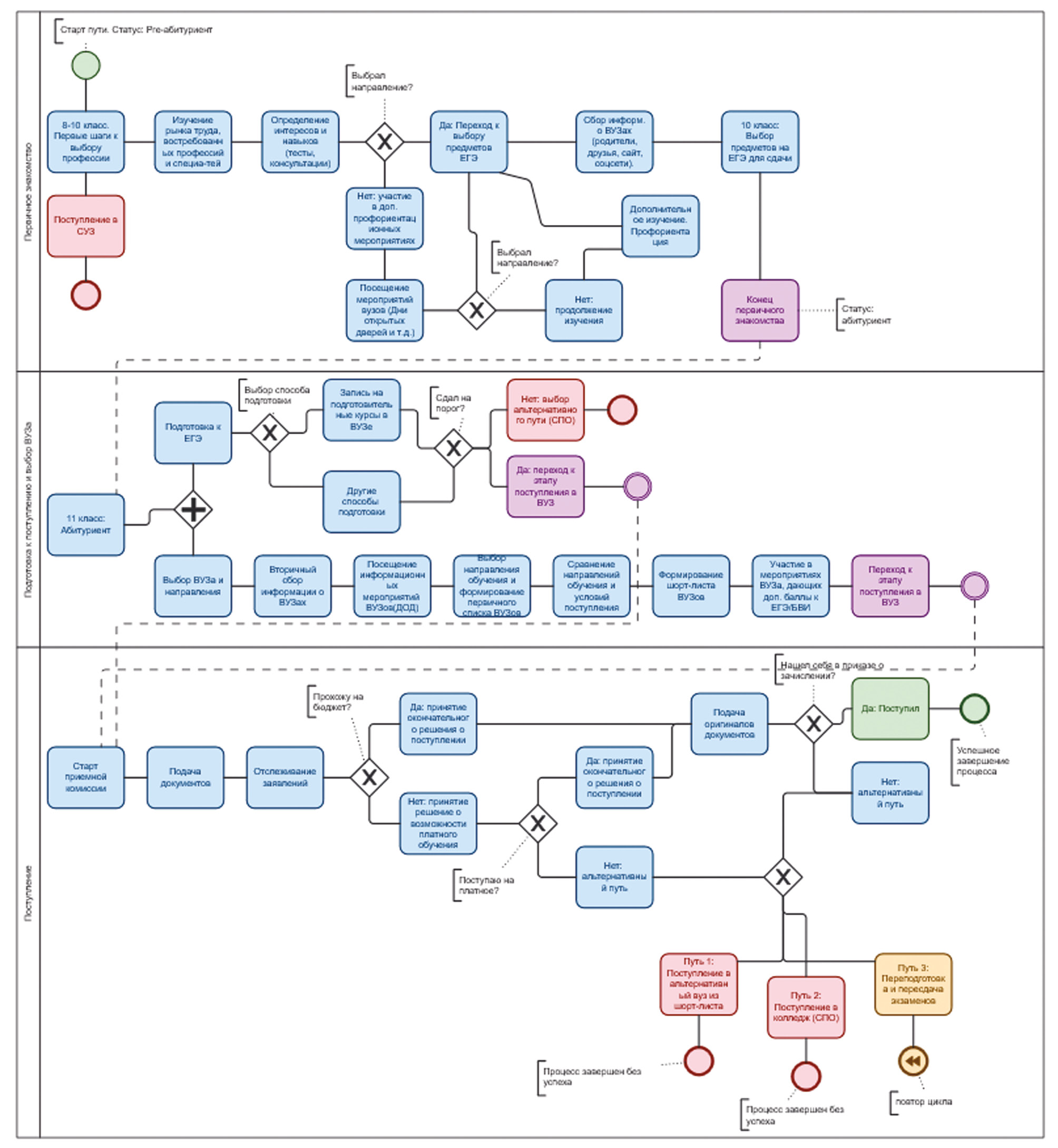 Результаты. В данной работе предлагается рассматривать модель «Путь абитуриента 2.0» как многоступенчатую систему формирования доверия, в которой университет должен сопровождать потенциального студента от первого контакта до момента поступления и за его пределами. Построенная модель «Пути абитуриента 2.0» в нотации BPMN представлена на рис. 1. Проведенный опрос показал, что при выборе вуза абитуриенты часто опираются на такие эмоциональные понятия, как «престиж направления», «бренд вуза». При этом достаточно часто называют в числе главных факторов выбора рациональные категории, однако качественный анализ поведения и взаимодействия с университетом показывает: даже рациональные критерии, по сути, служат маской для глубинных эмоциональных процессов выбора. Поведение абитуриента на поздних этапах воронки продаж часто выглядит рационально, но само вхождение в эту воронку начинается с эмпатии, узнавания и «внутреннего согласия» [5].