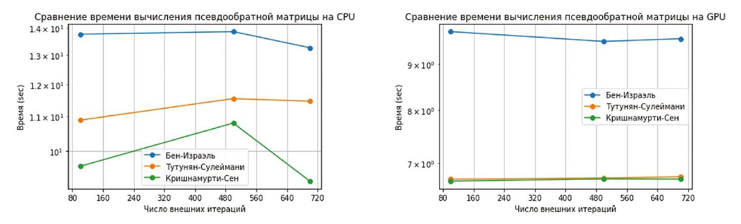 Результаты. На рис. 1 представлены графики сравнения времени вычисления псевдообратной матрицы для методов (1)–(3), примененных к матрице на CPU и GPU.