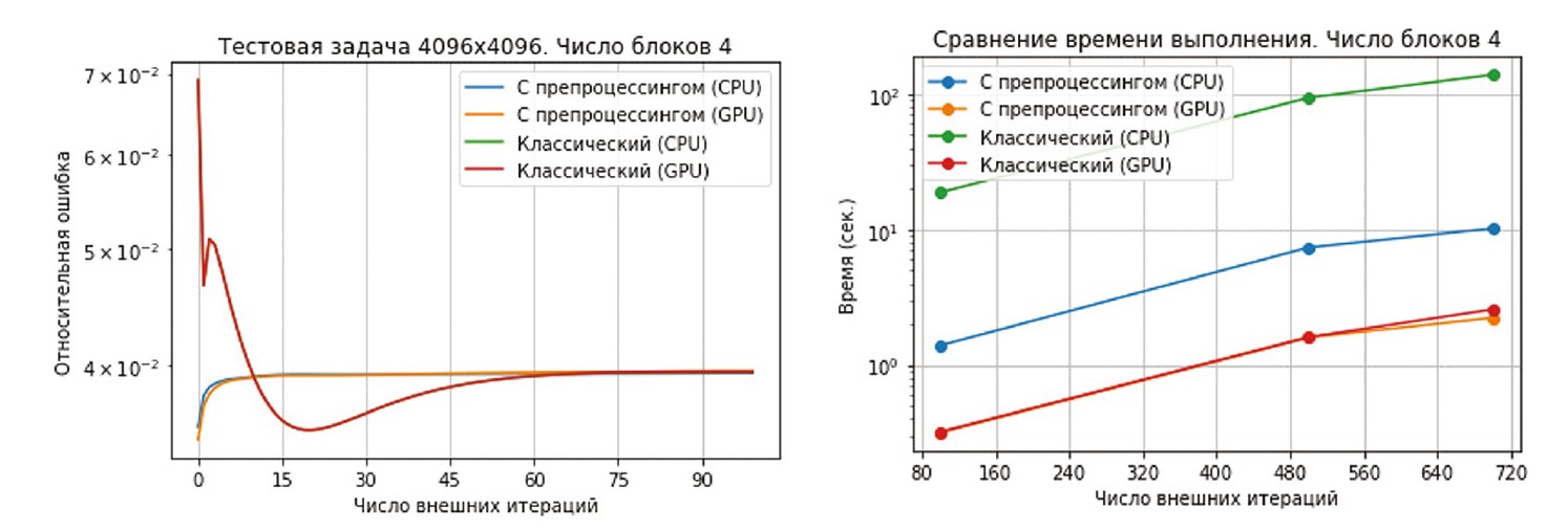 На рис. 2 приведены графики, демонстрирующие сравнение относительной ошибки и времени выполнения классического алгоритма и его версии с препроцессингом для матрицы .