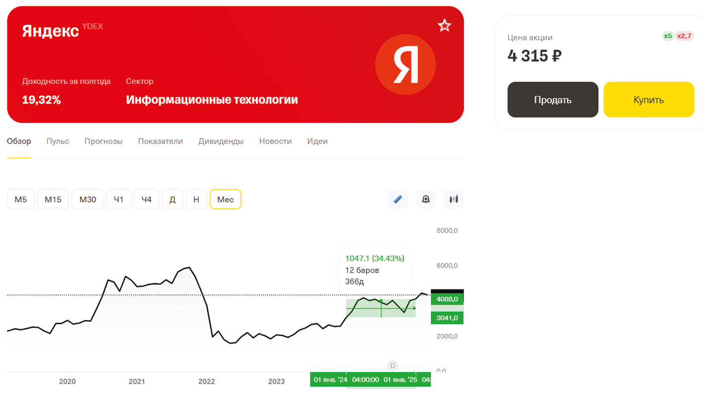 Компания активно внедряет новинки, становясь для клиентов максимально привлекательной, подобные изменения позволили увеличить выручку компании до 1 трлн руб. в 2024 году, что больше на треть по сравнению с 2023 годом, вместе с тем выросла и чистая прибыль компании составив 100 млрд руб. В планах компании на 2025 г. продолжить рост выручки в аналогичной динамике. Акции компании за последний год также увеличились в стоимости более чем на треть (рис. 2).