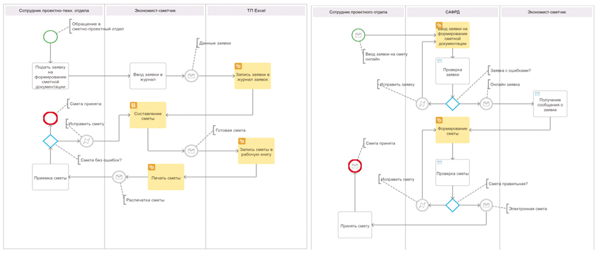 Рис. 1. BPMN-диаграммы процесса формирования сметной документации (до/после)
