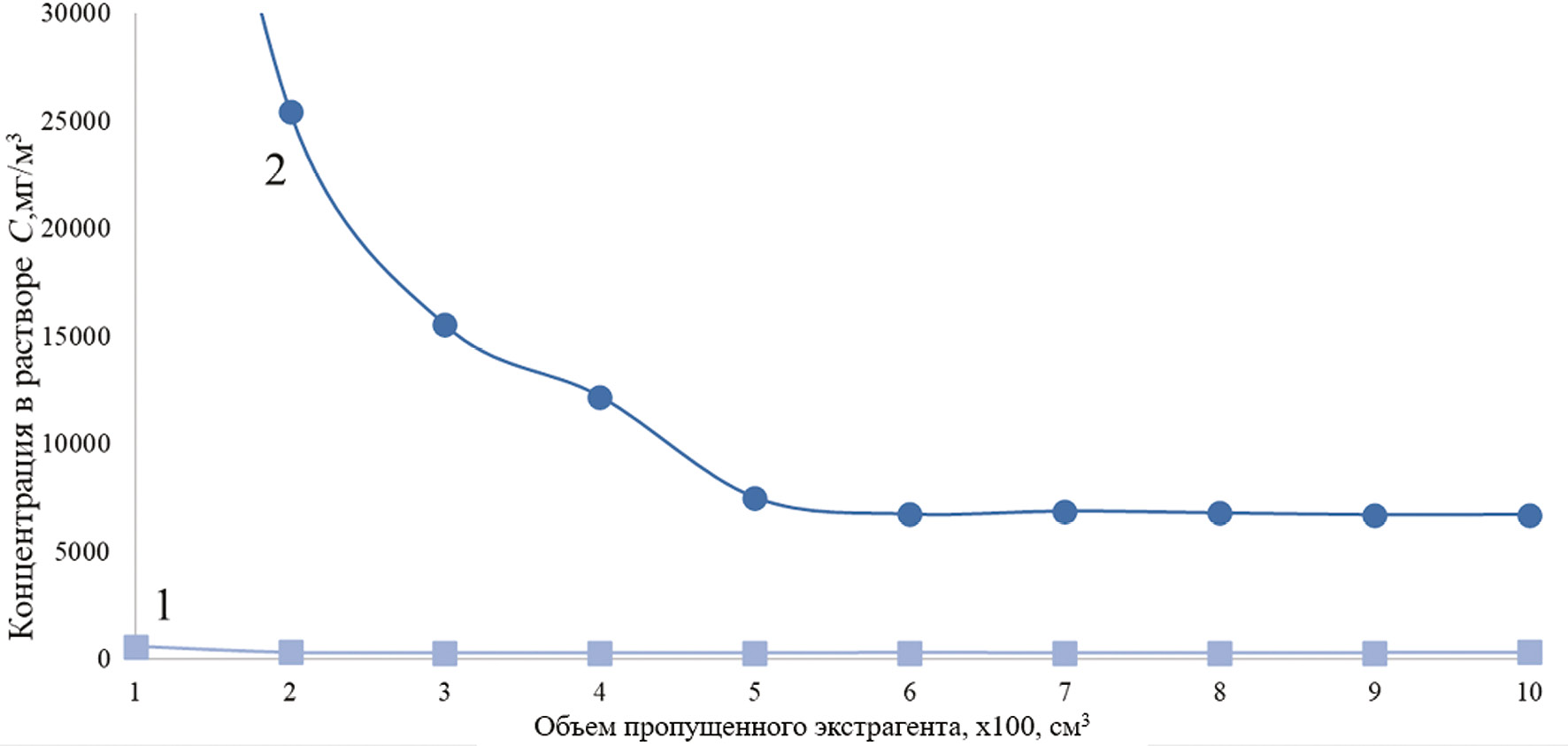 Экстракция проводилась в динамическом режиме — экстрагент подавался из сосуда с помощью насоса высокого давления в термостатируемый экстрактор. Аналиты элюируются потоком подвижной фазы в сосуд для приема экстракта. В качестве экстрагента использовался н-октан. Скорость потока подвижной фазы — 3 см3/мин, температура экстракции 25, 50 и 75 ℃. Давление 100–110 атм. Объем аликвоты 100 см3. Общий объем пропущенного экстрагента 1000 см3.