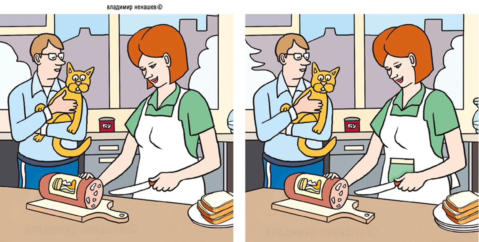 Методы. Для отбора испытуемых в разные группы использовался хронометраж игрового времени. Для измерения избирательности внимания использовался тест «Поиск отличий», где респондентам нужно было за 20 секунд найти отличия между картинками (рис. 1). А после они записывали количество различий. Этот показатель и стал основой для сравнения между двумя группами. Для математической обработки данных был использован U-критерий Манна–Уитни.