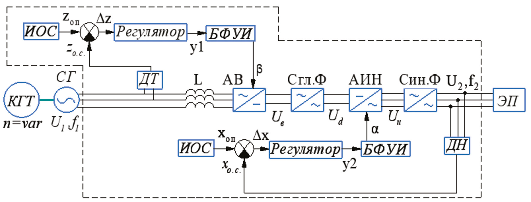 Схема автономного электроснабжения включает в себя: компрессор газовой турбины (КГТ); синхронный генератор на постоянных магнитах (СГ); преобразователь частоты; дроссель (L); сглаживающий фильтр (Сгл.Ф); автономный инвертор (АИН); синус фильтр (Син.Ф); датчик напряжения (ДН); датчик тока (ДТ); источник опорного напряжения (ИОС); блок формирования управляющих импульсов (БФУИ); потребитель (ЭП). В представленной схеме частота вращения вала компрессора газовой турбины (КГТ) позволяет генерировать электроэнергию с частотой около 100 Гц. Более высокая частота, по сравнению с промышленной частотой 50 Гц, позволяет улучшить массогабаритные показатели установки. Данная схема позволяет регулировать и контролировать ток, потребляемый от СГПМ, совпадающий по форме и фазе с напряжением, и обеспечивать требуемый уровень выпрямленного напряжения.