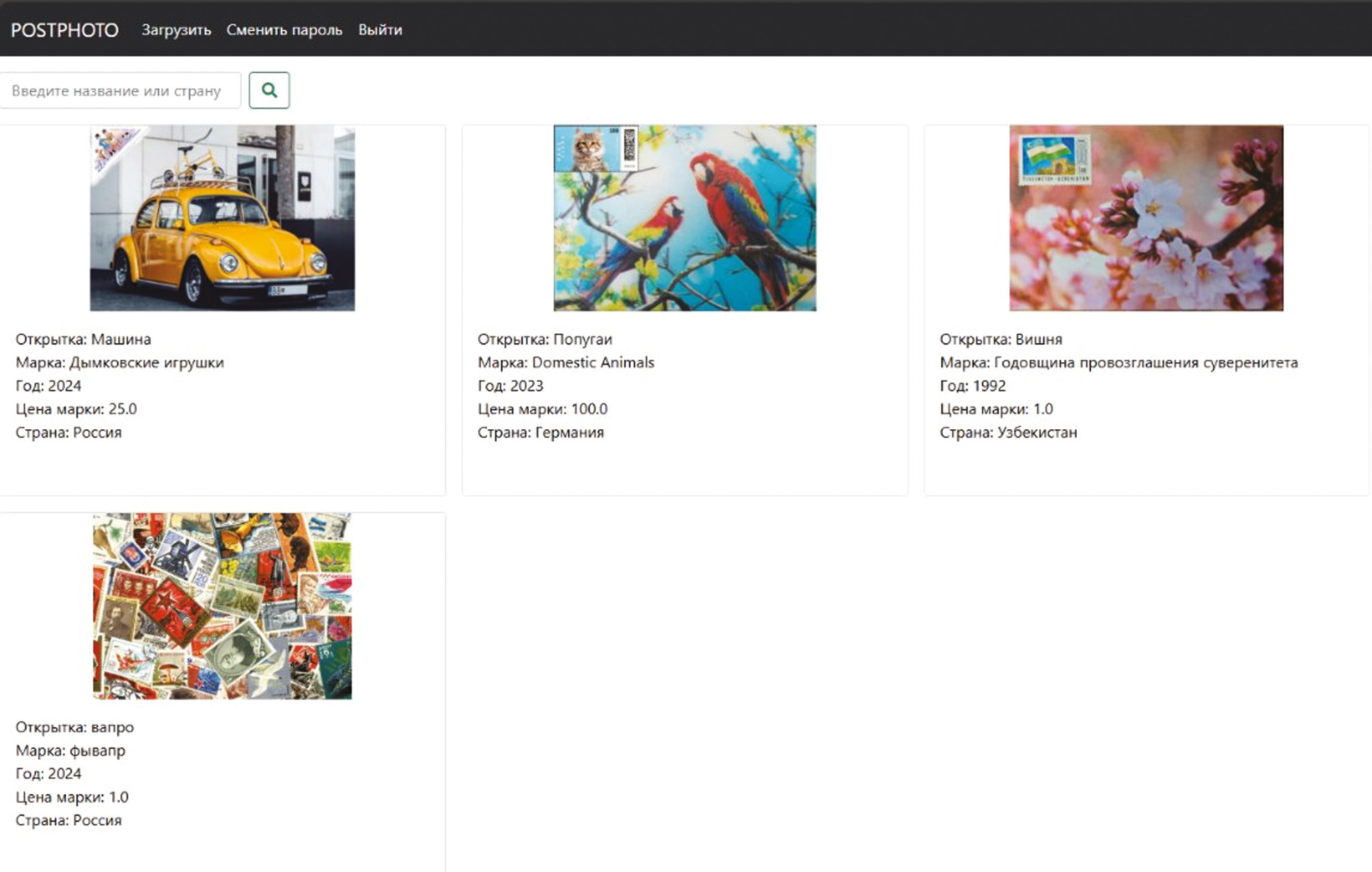 Сайт предлагает простую процедуру регистрации, позволяющую пользователям легко создавать учетные записи на сайте. Разработана форма добавления новой открытки, включающая основные характеристики, такие как название открытки и марки, год выпуска марки и страна отправителя, фотография. Важной особенностью приложения является механизм поиска открыток по ключевым параметрам: по названию страны или открытки. Это помогает пользователям быстро ориентироваться в собственной коллекции.